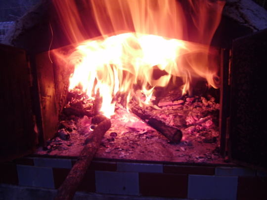 窯に張り付いた板は焦げるけれどなかなか燃え出さない